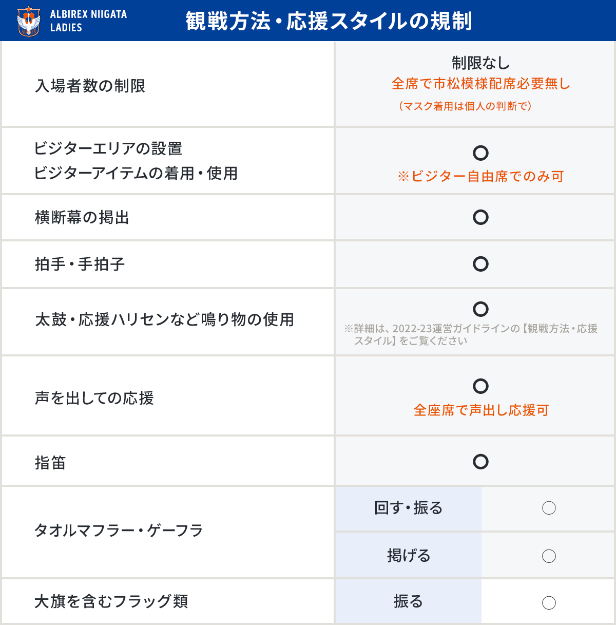 ・ビジター席以外(プレミアムメインスタンド席、メインスタンドS席のみ)でもビジターチームのグッズを着用しての観戦も可能となります。なお、ビジターチームサポーターの声を出しての応援、鳴り物の使用は、ビジター席にてお願い致します。ピッチだけでなくスタンドでもフェアプレーの精神で、マナーを守った観戦、応援をお願い致します。