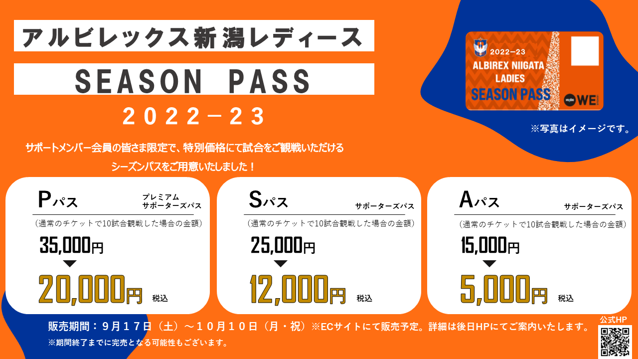 シーズンパスは2025/26WEリーグクラシエカップならびにSOMPO WEリーグの試合をオトクかつスムーズに観戦いただける年間チケットとなります。(一部対象外の試合あり)シーズンパスは3券種。オフィシャルオンラインストアにて販売中です。
