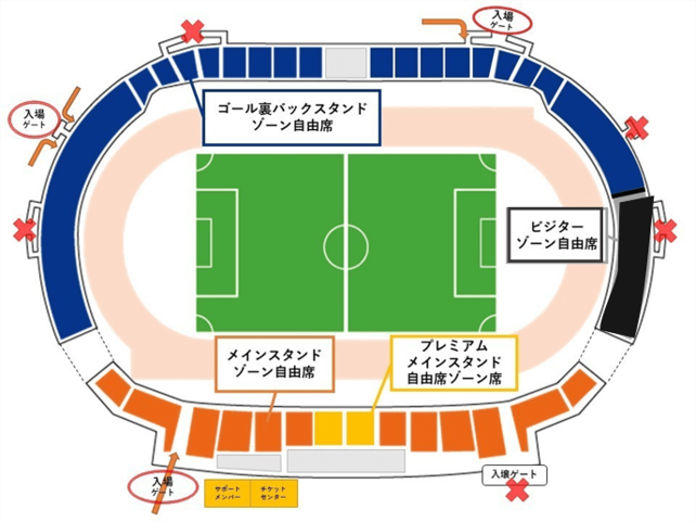| ゴール裏バックスタンドA席 ゾーン 自由席 | 1,500円 | 500円 | 2,000円 | 1,000円 | |||
