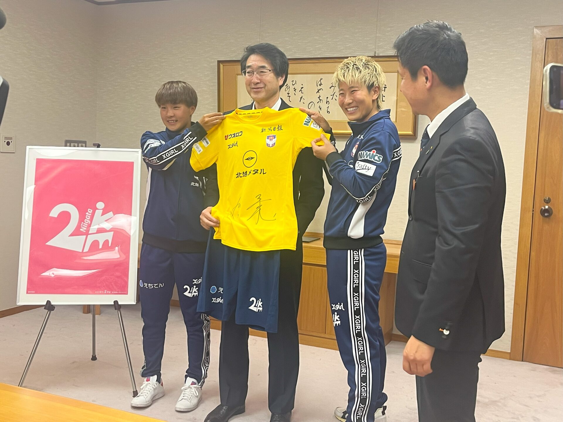 いつもアルビレックス新潟レディースへ温かいご声援をいただき、誠にありがとうございます。 11月9日(木)に川澄奈穂美選手、橋川和晃監督、山本英明代表取締役社長が 新発田市の二階堂馨市長を表敬訪問いたしました。