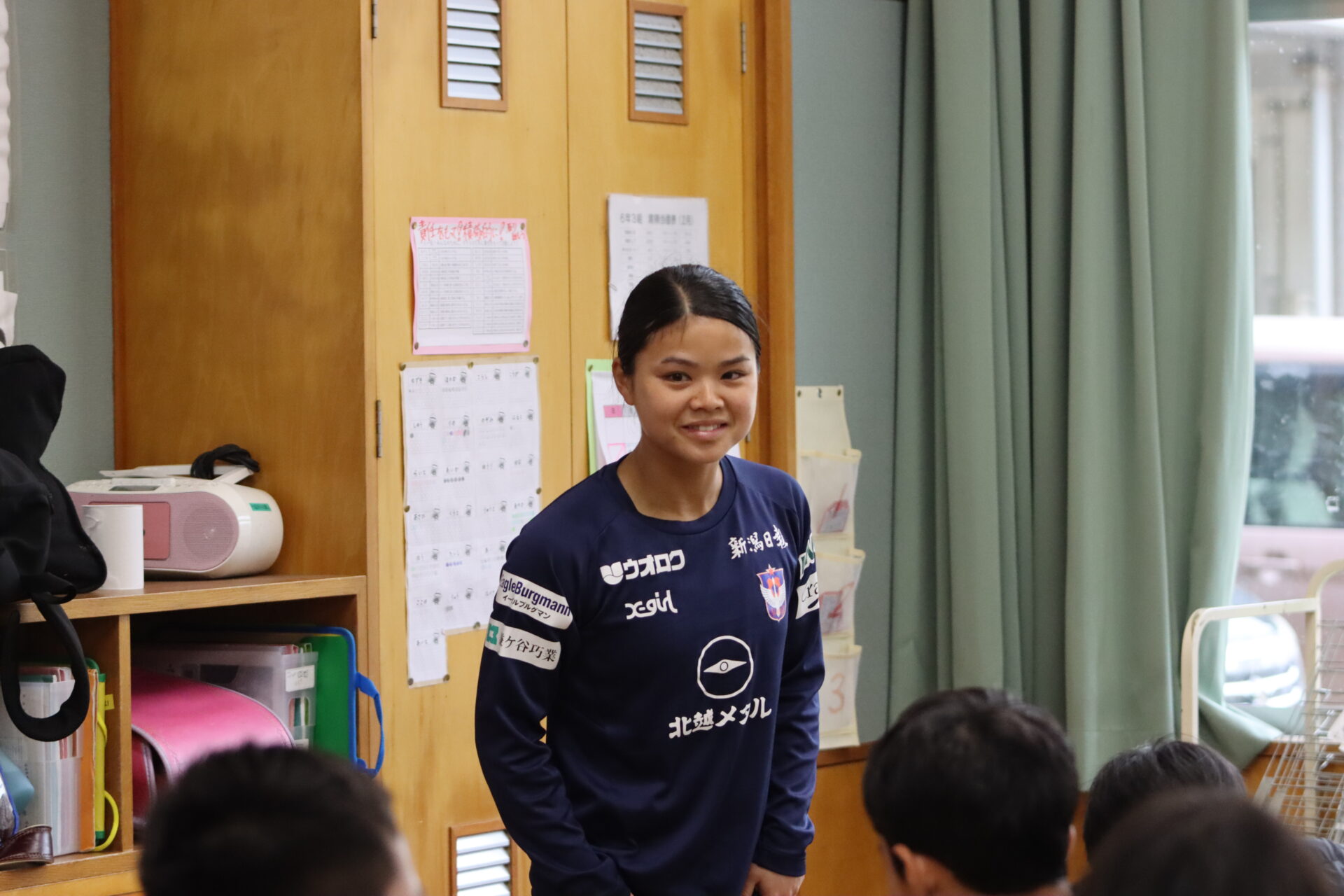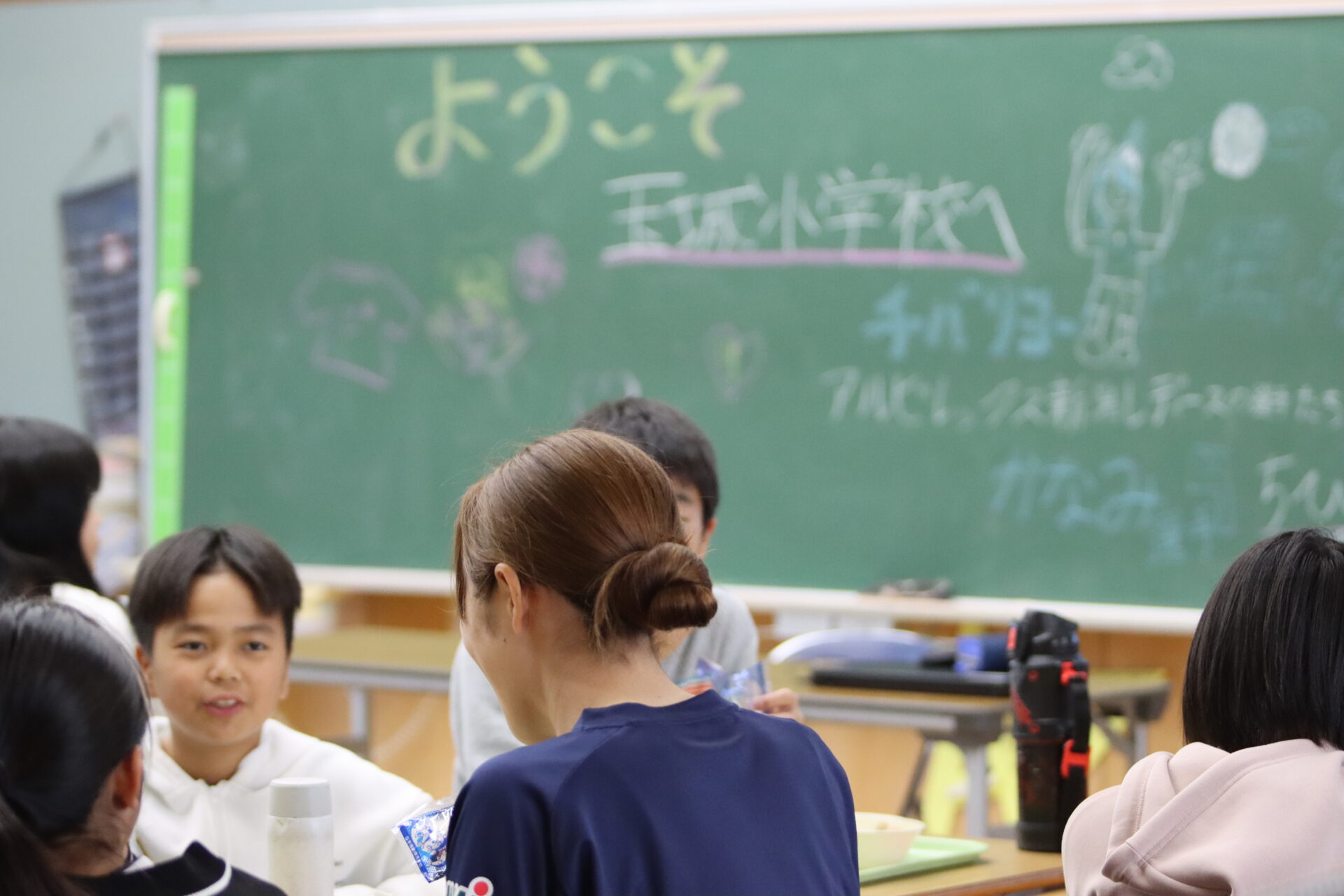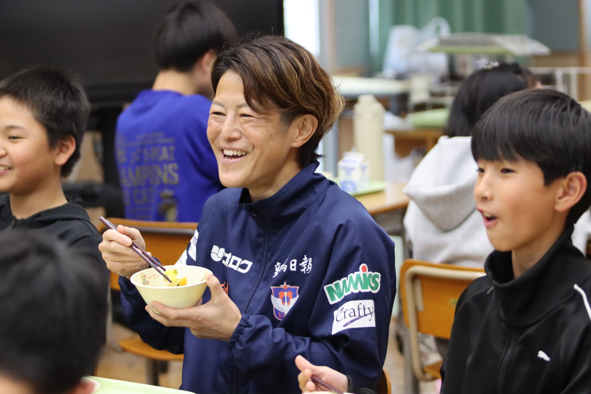 練習終了後、練習会場として利用させていただいている南城市陸上競技場の近隣小学校「玉城小学校」に有吉佐織選手、新堀華波選手、石田千尋選手、山本結菜選手がお伺いし、学校給食を一緒に楽しみました。選手たちは久しぶりの給食に興奮気味。それぞれ担当する6年生のクラスに入ると歓声で迎え入れられます。サッカーに関する質問や新潟県についての質問を受けます。一方選手たちは沖縄の方言を教えてもらったり、今はまっていることなどを生徒の皆さんに教えてもらうなど色々なお話をして交流します。
