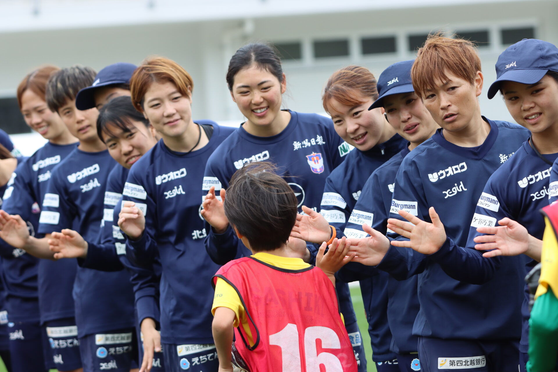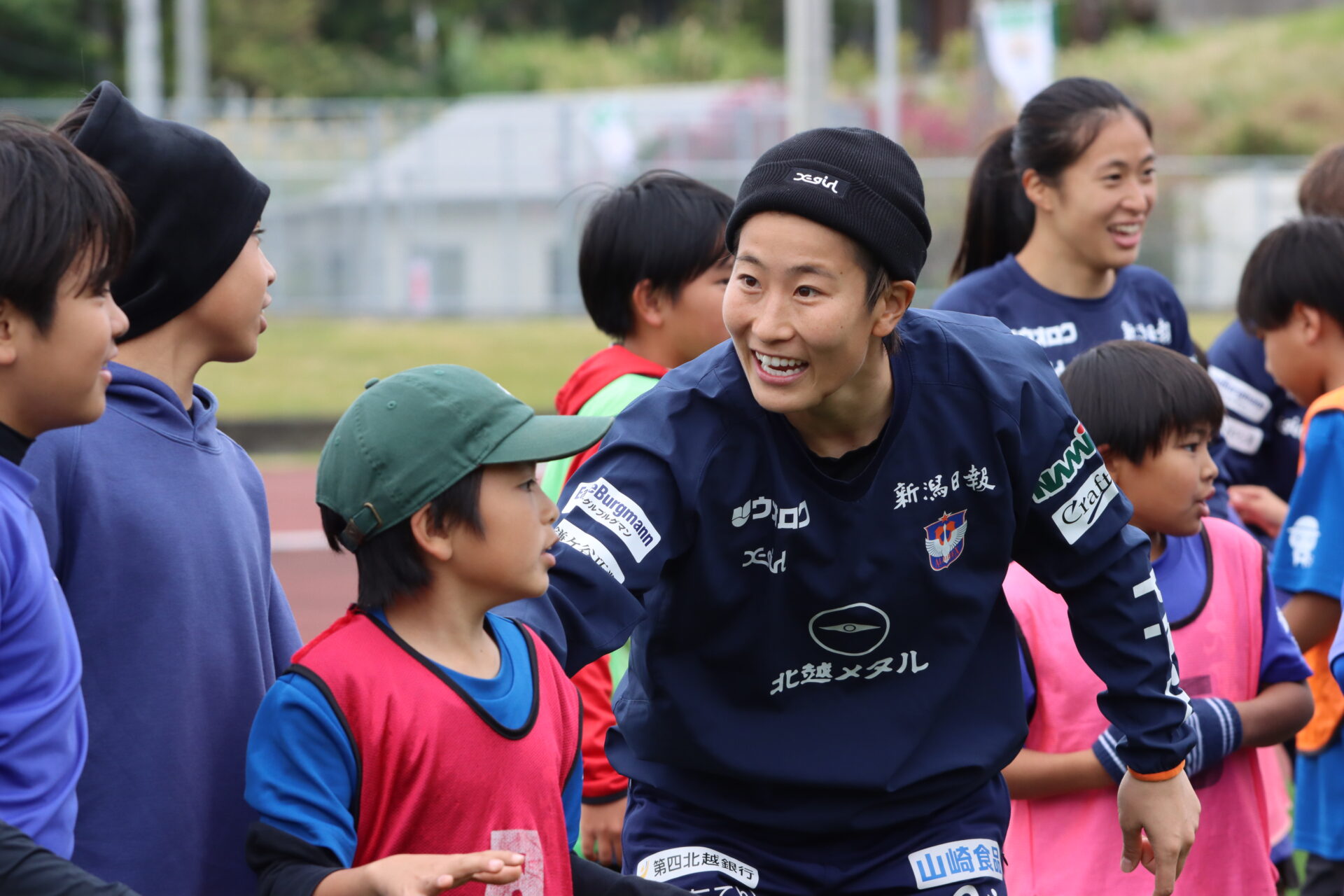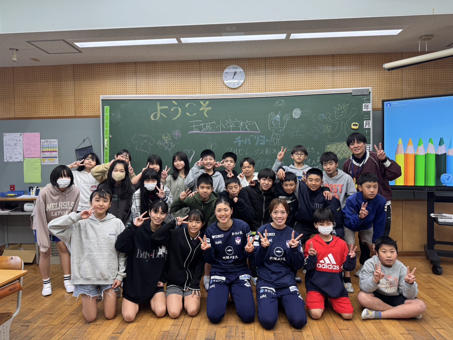 練習終了後、練習会場として利用させていただいている南城市陸上競技場の近隣小学校「玉城小学校」に有吉佐織選手、新堀華波選手、石田千尋選手、山本結菜選手がお伺いし、学校給食を一緒に楽しみました。選手たちは久しぶりの給食に興奮気味。それぞれ担当する6年生のクラスに入ると歓声で迎え入れられます。サッカーに関する質問や新潟県についての質問を受けます。一方選手たちは沖縄の方言を教えてもらったり、今はまっていることなどを生徒の皆さんに教えてもらうなど色々なお話をして交流します。