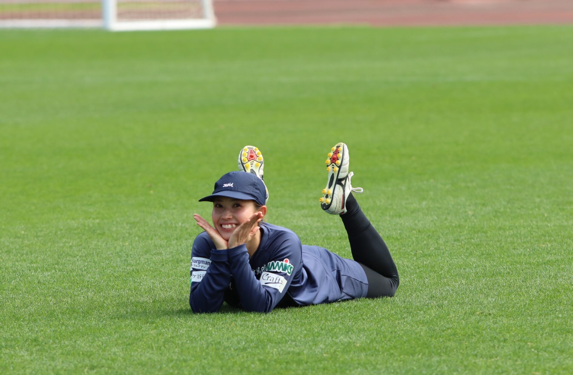 練習後は天気も良かったので各自トレなどを行います。武田あすみ選手が広報をヘルプに。 選手たちもとても良い笑顔で写真撮影に応じてくれていました。中には思わず笑ってしまうような写真も…👀