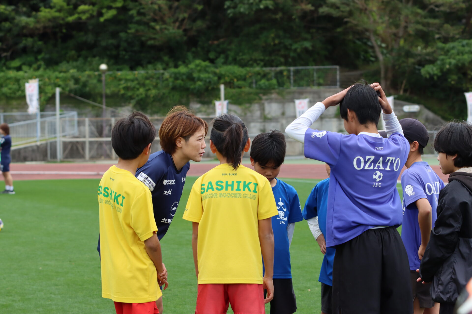 この日は練習終わりにサッカー教室を実施。約60名の地域のサッカークラブに所属する小学生の皆さんに参加いただきました。 沖縄の食べ物の名前のチームに分かれて、誕生日月に分かれて集まるワークやボール遊びなどのレクリエーションを実施しました。 順位を競うゲームでは選手たちも一緒に本気で挑みます。ゲームでは、最後に子どもたちと選手の真剣勝負🔥負けてとても悔しっているチームもありました。 たくさんの沖縄県の少年・少女と交流しとても楽しい時間を過ごしました。