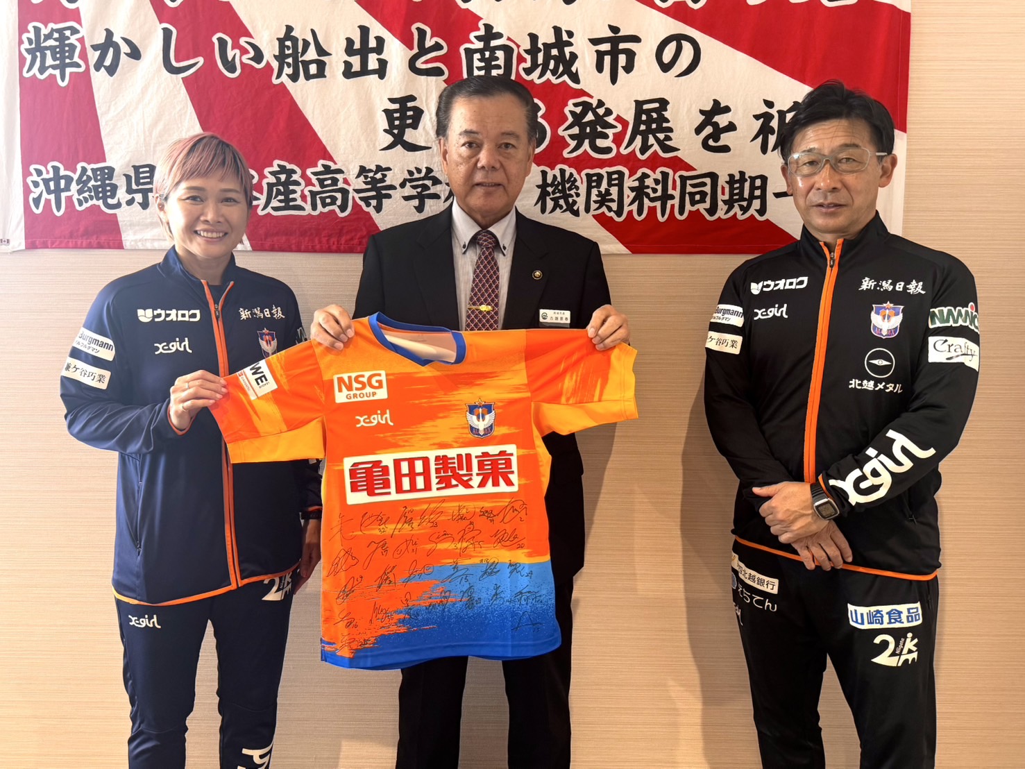 そして、午後は山本社長、橋川和晃監督、川澄奈穂美選手が表敬訪問へ。 まず最初に南城市古謝市長にご挨拶へ。ホテルからのアクセスも良く、トレーニングルームもある南城市陸上競技場 で練習させていただいている御礼をお伝えしました。市長からも激励のお言葉を頂戴しました。その後 、南城市商工会 様にも訪問し、ご挨拶をさせていただきました。津波古会長はサッカーをご経験されていたとのことで、昨今の女子サッカーの全国的な普及発展に評価感心を示されながら、アルビレックス新潟レディースへリーグ後半戦再開に向けて応援のお言葉をいただきました。