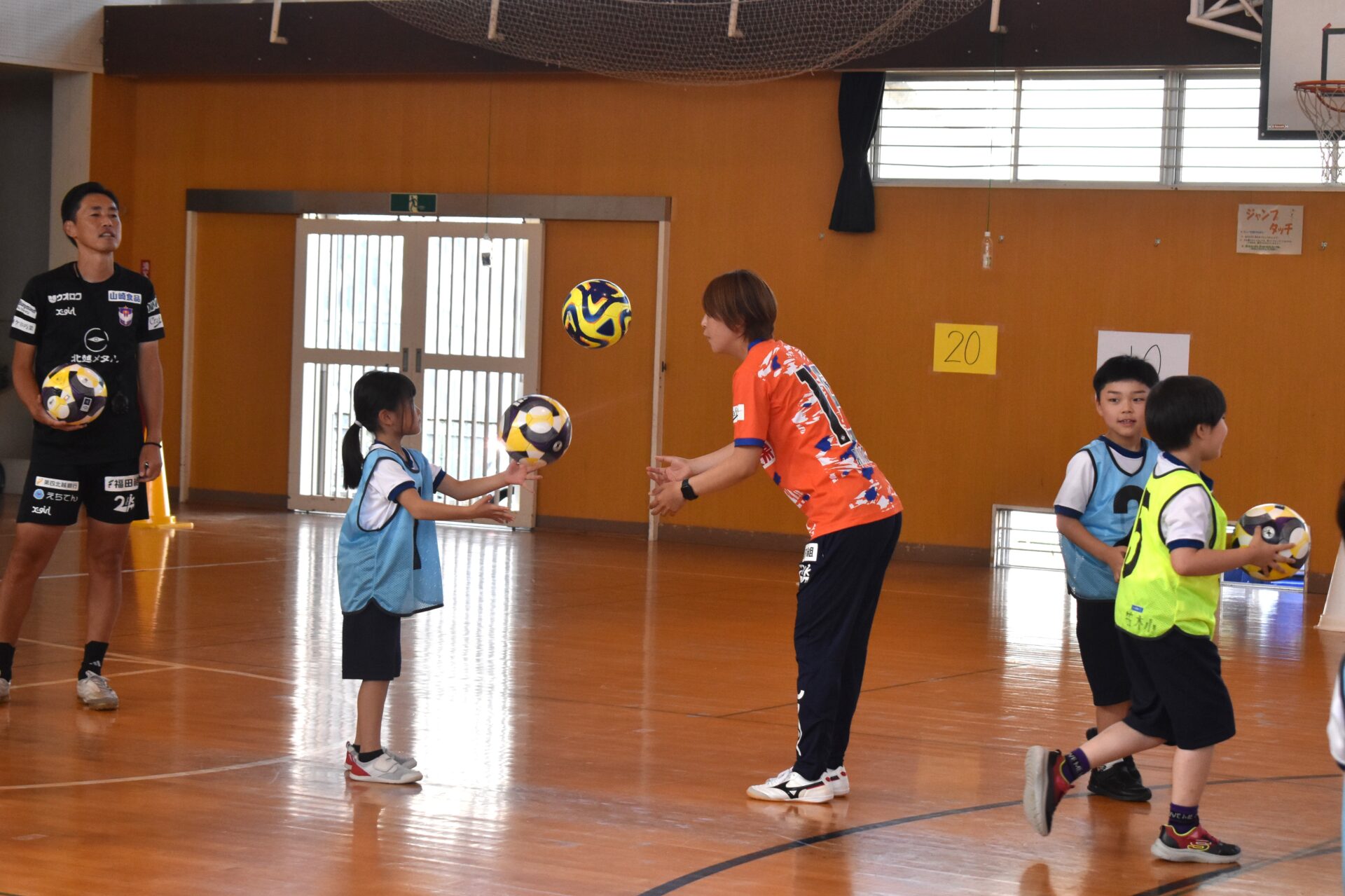 小学2年生とその保護者の皆さまと、ボール運動を楽しみました。親子でいっしょに身体を動かし、手でボールを触ったり足でボールを運んだりしながら、最後はゲームにチャレンジ!子ども対大人の試合では、9点対9点の同点!たくさんのゴールが生まれました。中野山小学校のみなさん、楽しい時間をありがとうございました!