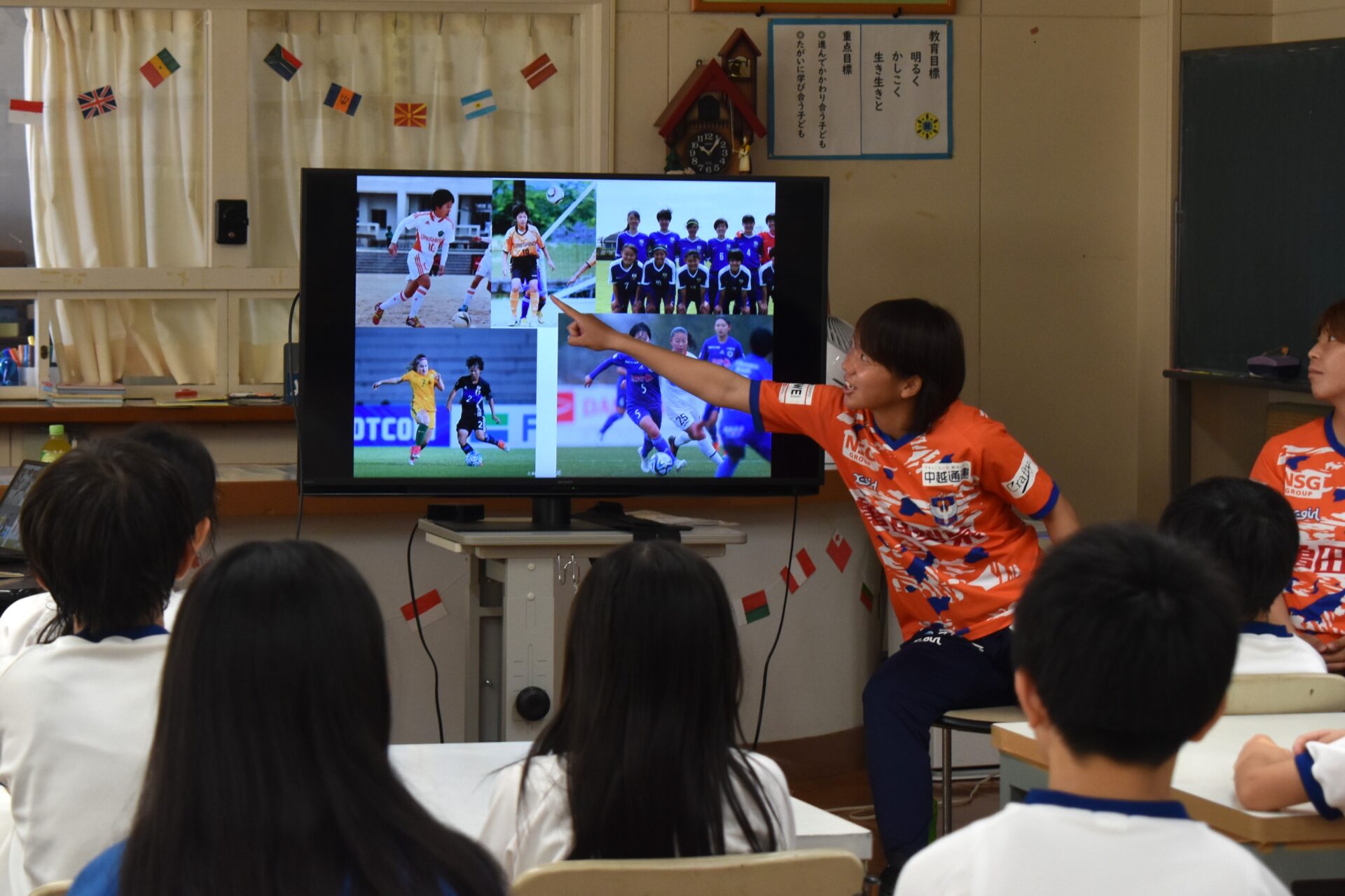 各クラスそれぞれの選手が授業を担当。キャリア教育では、試合に臨む心構えや支えてくれている人の大切さを話しました。また、実技では見本を見せながら一緒にプレーしました。