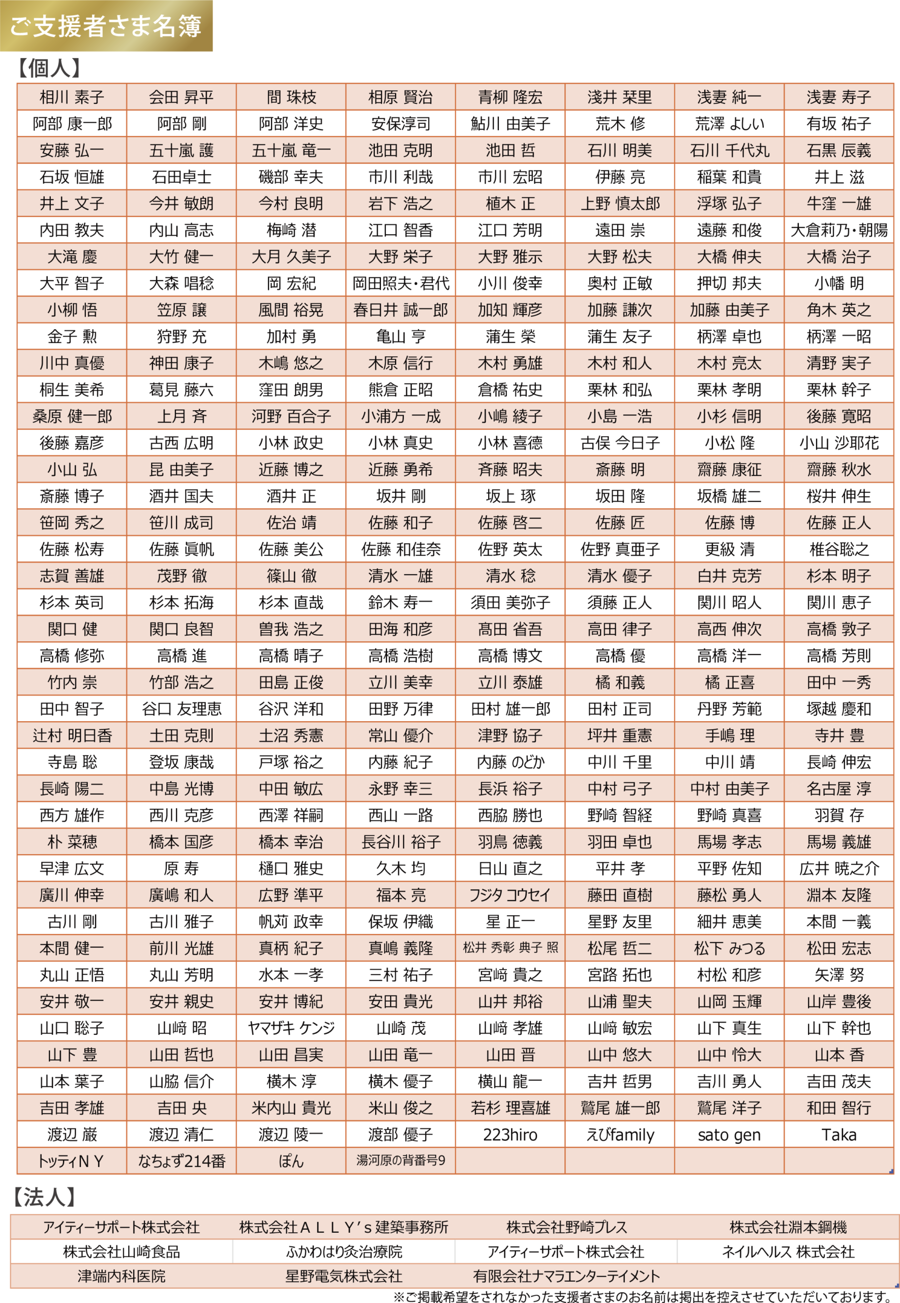 多くの皆さまからご支援賜りましたこと、重ねて御礼申し上げます。