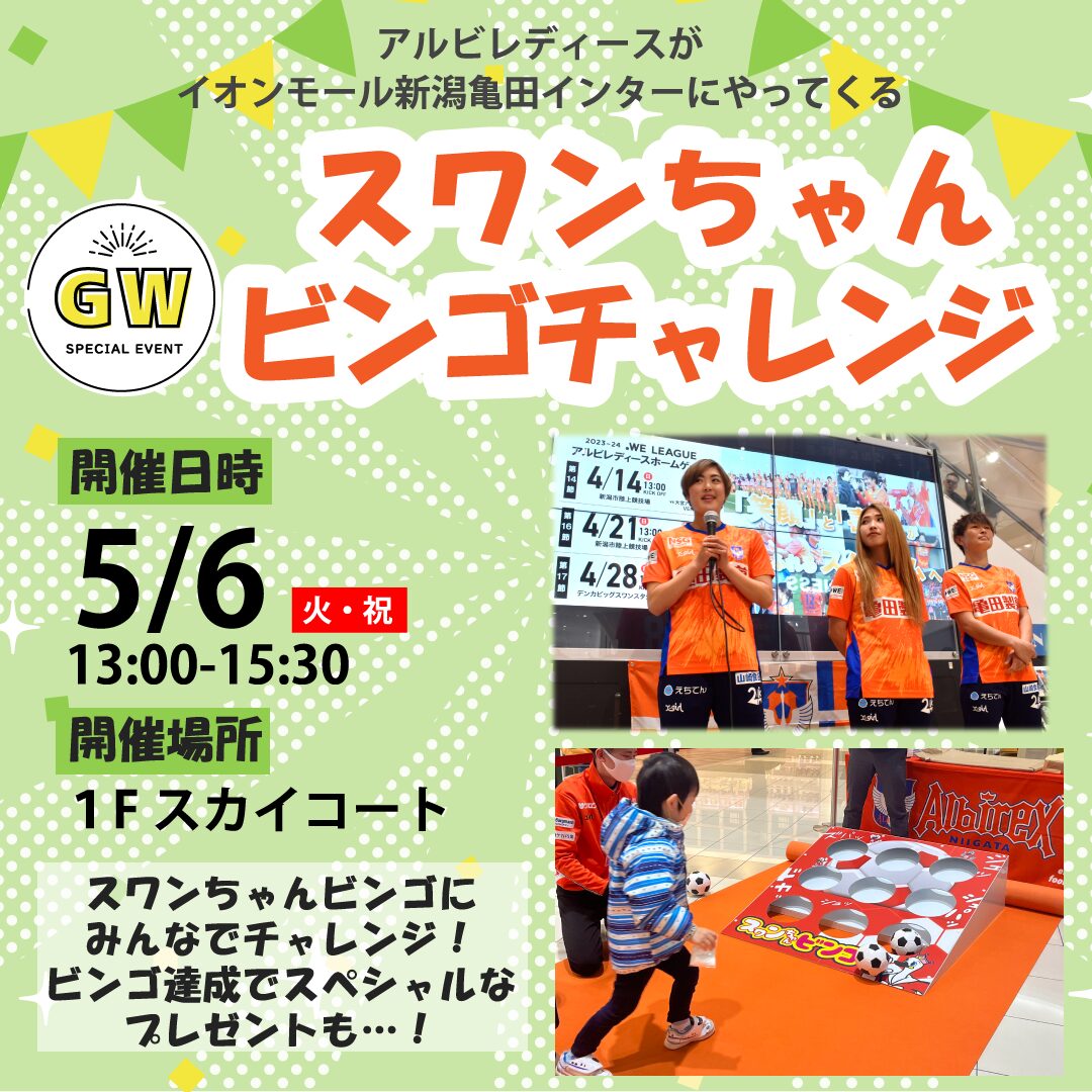 試合会場で大人気なアトラクション「スワンちゃんビンゴ」がイオンモール新潟亀田インター店に登場!また、新アトラクションの輪投げも実施!!レディースの選手とビンゴを目指してチャレンジしましょう!