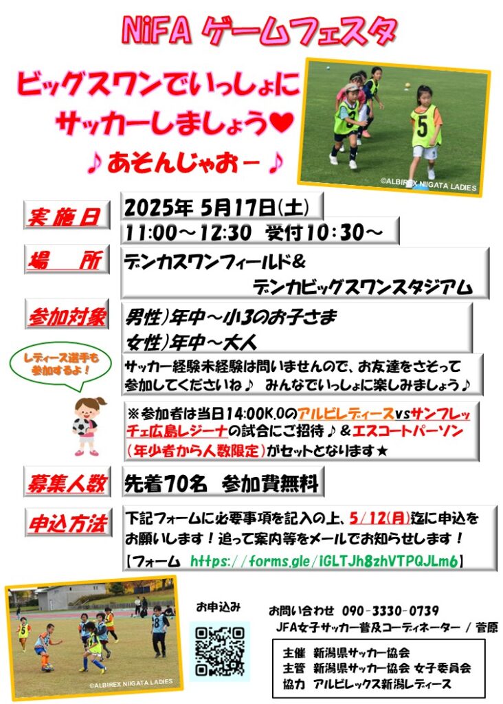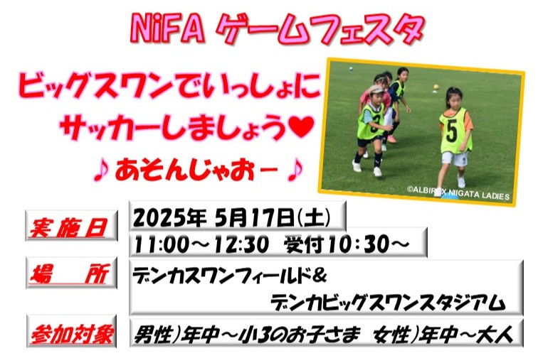 5月17日(土)にデンカビッグスワンスタジアムにて開催される2024-25 WEリーグ 第22節サンフレッチェ広島レジーナ戦において、『NiFAゲームフェスタ』を開催することとなりましたので、お知らせします。