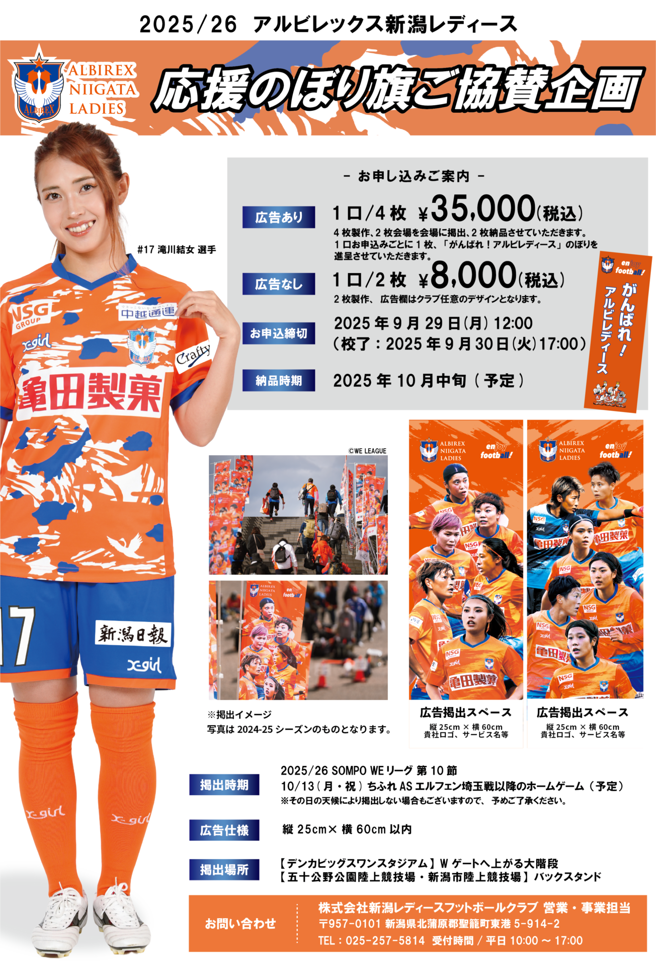 『アルビレックス新潟レディース 応援のぼり』協賛企業様募集のお知らせ