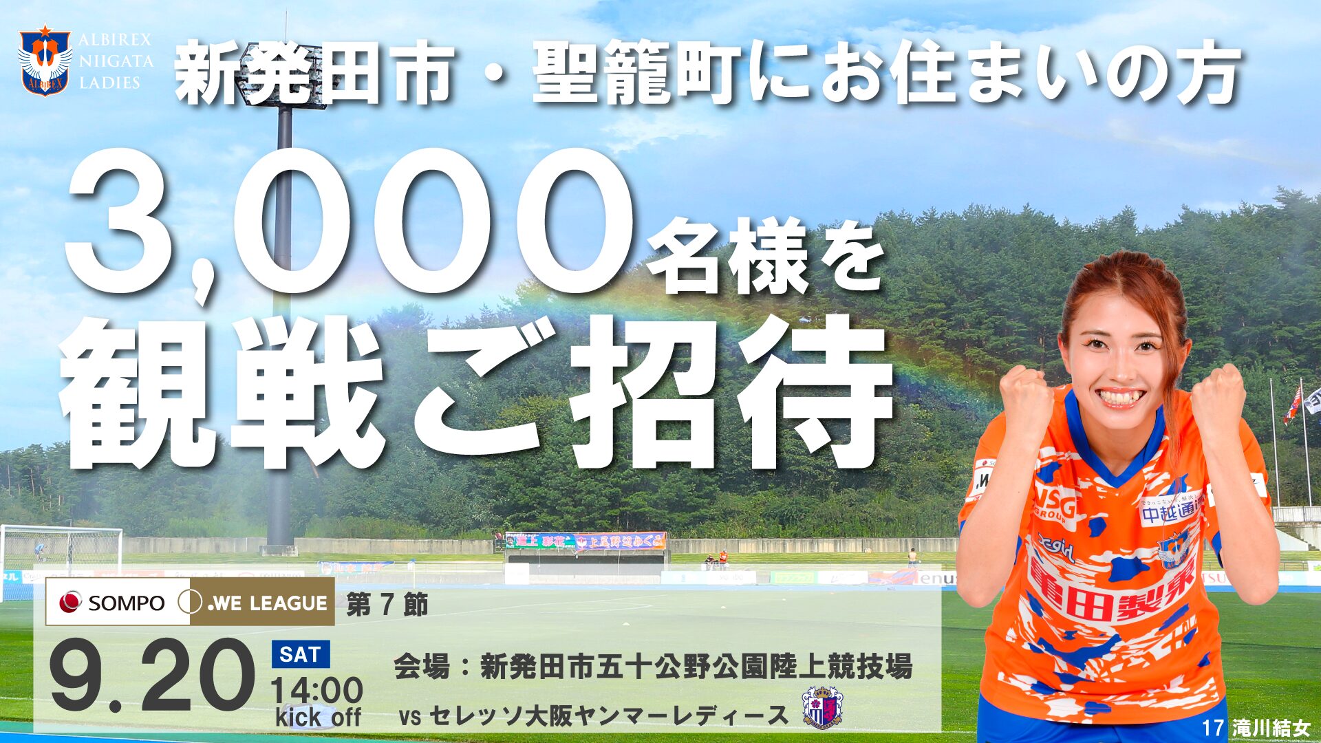 9/20(土)に開催いたします2025/26SOMPO WEリーグ(セレッソ大阪ヤンマーレディース戦)に新発田市・聖籠町のお住まいの皆様をスタジアムでの試合観戦にご招待いたします。
