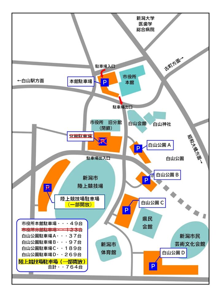 ※新潟市陸上競技場敷地内駐車場(enjoyパーク&関係者駐車場/一部開放)および市役所分館駐車場(閉鎖中)はご利用できませんので予めご了承ください。