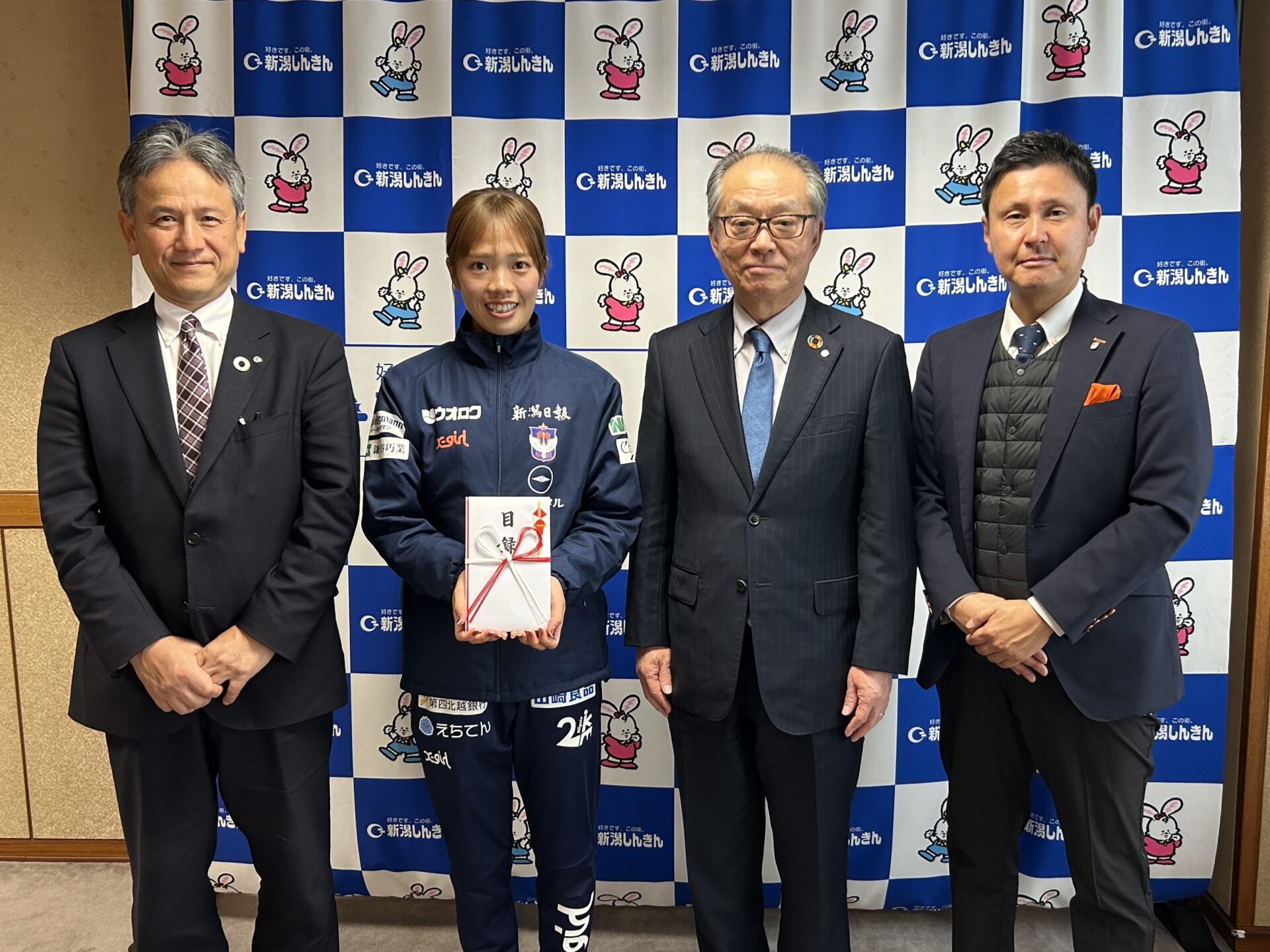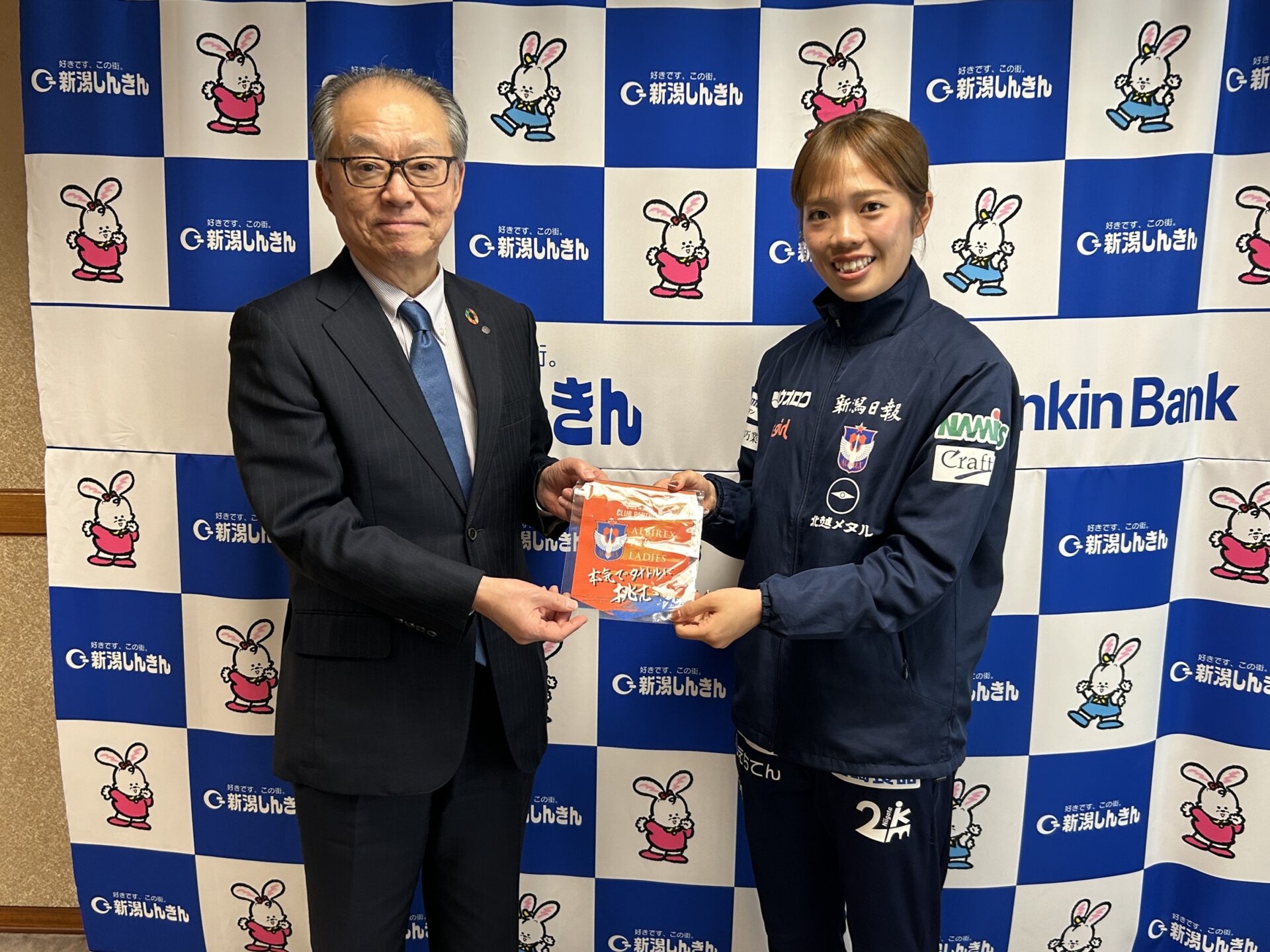 本日、クラブスポンサーとして長年ご支援いただいている新潟信用金庫様より、アルビレックス新潟・アルビレックス新潟レディース応援定期預金「力戦2024」の取り扱いに伴うクラブ支援金の贈呈をいただき、クラブを代表して新堀華波選手が拝受しました。