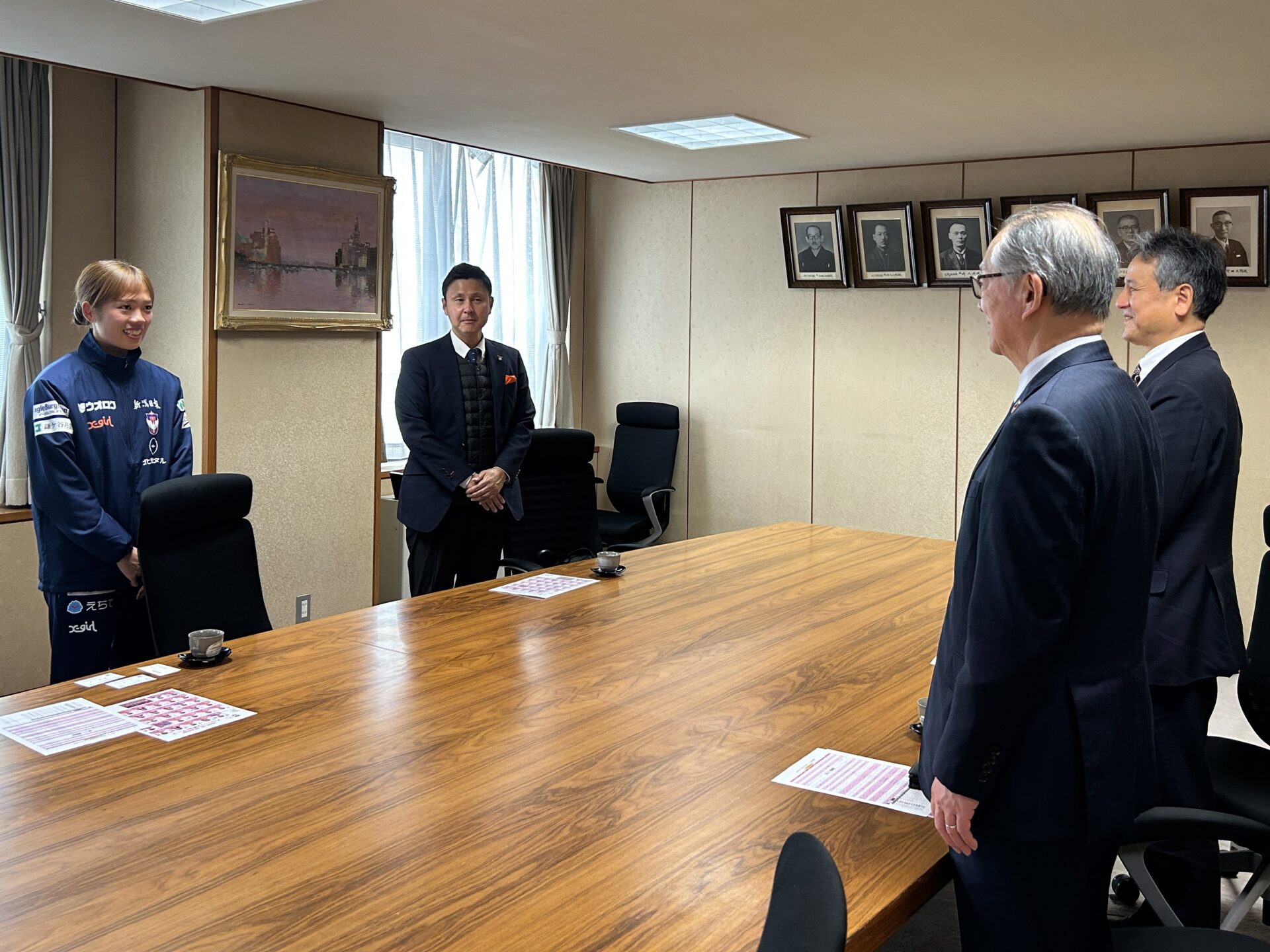 同庫の小松理事長からはリーグ後半戦、タイトル獲得に向けた激励のメッセージをいただき、また今年2月に加入した新堀選手に新潟に来てからのプレー環境や生活環境についてなど、様々な質問をいただきました。