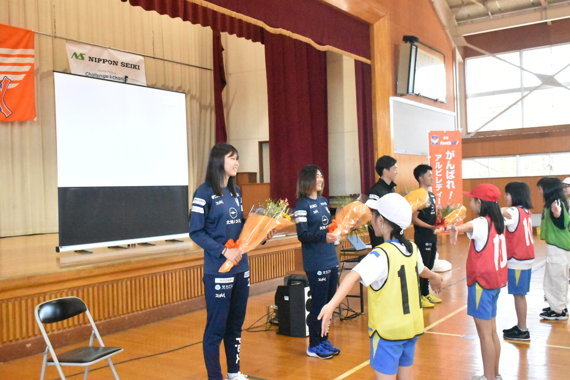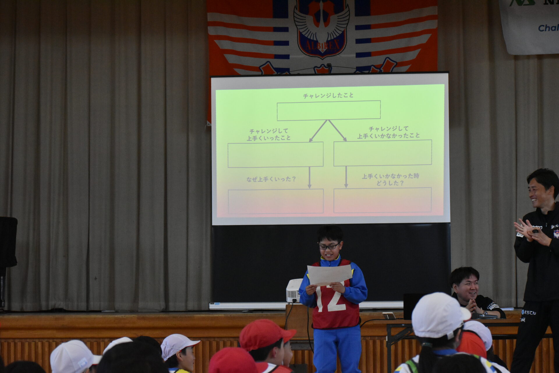 後半のキャリア教育では、体育館でスクリーンにスライドを投影し、小穴 U-15監督の司会進行のもと日本精機グループの社員の山中様、関原小学校5年生担任の内堀先生、 石田千尋 選手 と 横山笑愛 選手から、これまでの人生で「チャレンジ」したことについて話をし、児童の皆様へメッセージを送りました。