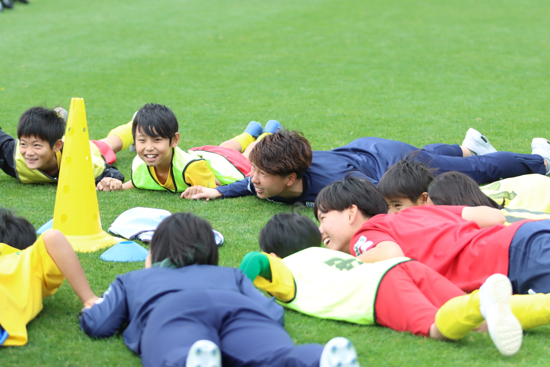 選手と一緒になって身体を動かし、学年ごとにグループ分けしたチームでミニゲーム。