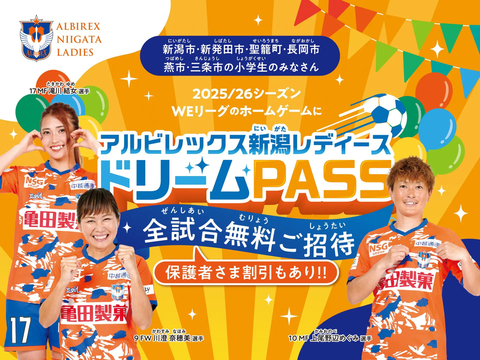 新潟市・聖籠町・新発田市・長岡市・燕市・三条市在学の小学生はアルビレディースのホームゲームを無料でご観戦いただけるドリームPASS。