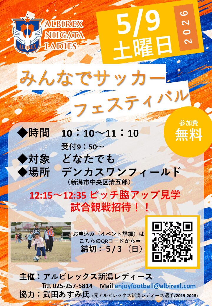 5月9日(土)2025/26 SOMPO WEリーグ 第21節 ノジマステラ神奈川相模原戦において、『みんなでサッカーフェスティバル』を開催することになりましたので、お知らせいたします。
